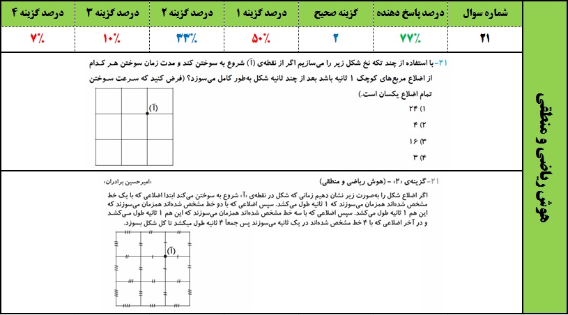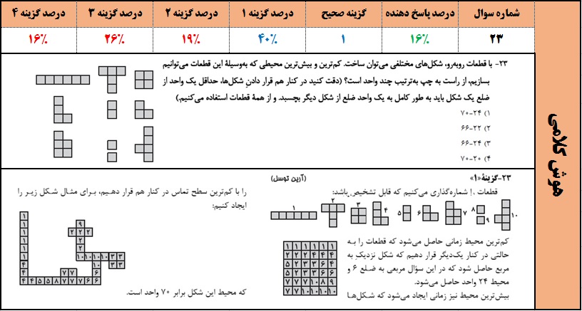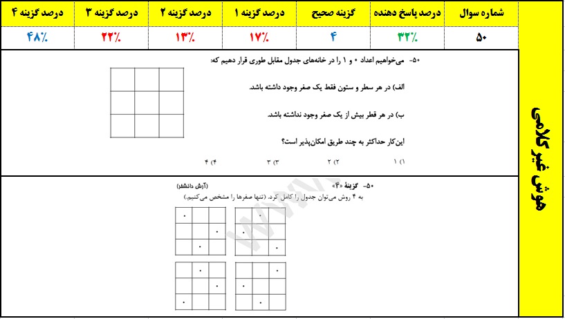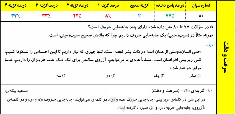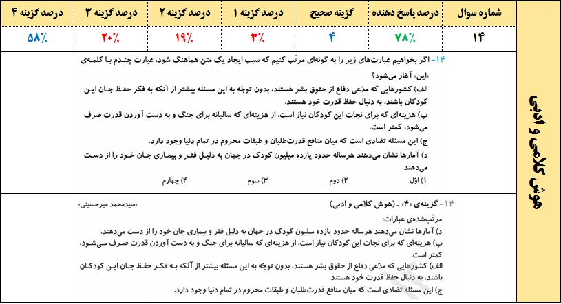 برای استفاده بیشتر دانش آموزان ، متن سوال ها و پاسخ های دام دار ، درصد پاسخ به این سوال ها ، گزینه صحیح ، درصد پاسخ به هرگزینه و درصد پاسخ به گزینه صحیح را نیز آورده ایم. سوال های امروز از سوال های آزمون 13 تیر انتخاب شده است.