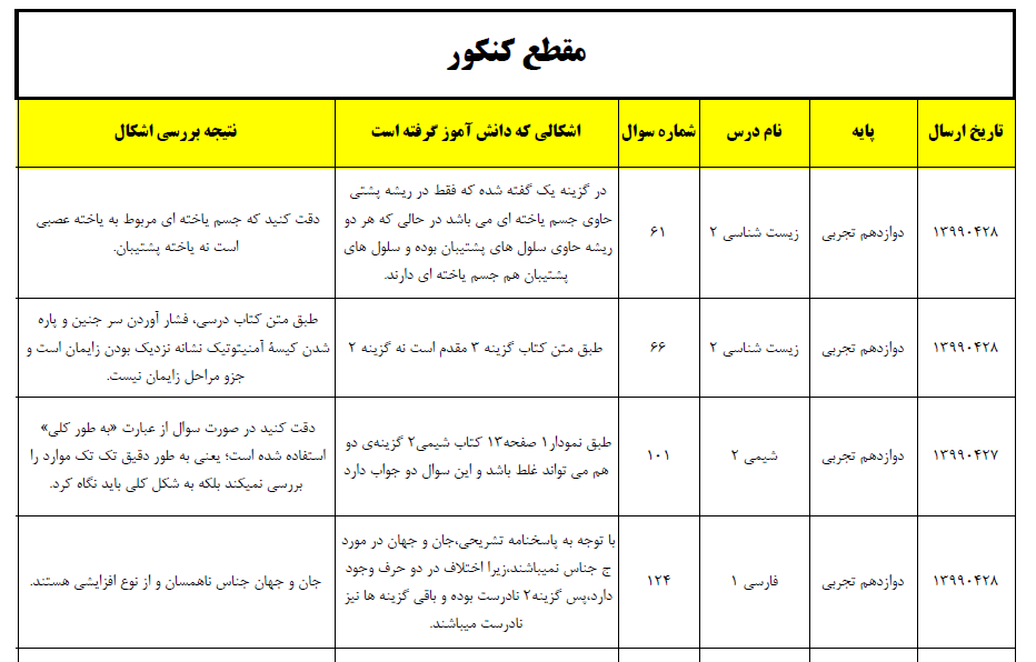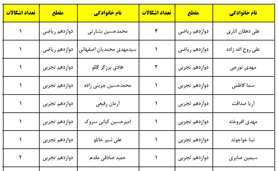 اسامی دانش آموزانی که برای آزمون 27 تیر اشکالی ارسال کرده اند در فایل PDF ضمیمه به طور کامل و باکیفیت ذکر شده است که نمونه فایل آن به صورت زیر است: