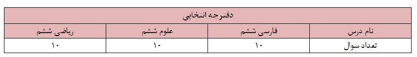 این دفترچه شامل سوالات سه درس ریاضی،فارسی و علوم سال ششم است.پاسخ به سوالات این بخش اختیاری است می توانید به یک درس یا دو درس و یا هر سه درس این بخش پاسخ دهید دقت کنید پیش خوانی دروس سال بعد به شما کمک می کند تا سال تحصیلی جدید را با آمادگی بیشتری آغاز کنید.به همین علت به شما توصیه می کنیم حداقل دو درس از سال ششم را در تابستان پیش خوانی کنید.در جدول زیر تعداد سوالات دفترچه ی انتخابی مربوط به هر درس مشخص شده است.