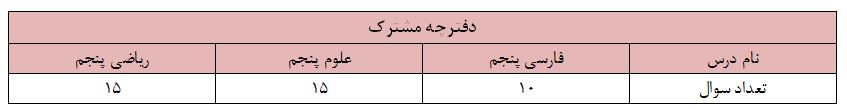 این دفترچه شامل سوالات سه درس ریاضی،فارسی و علوم سال پنجم است.تمام دانشاموزان باید به سوالات این بخش پاسخ دهند.