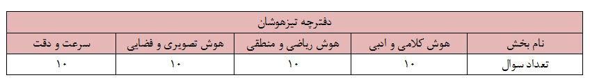 این بخش شامل سوالات استعداد تحلیلی در چهار بخش هوش کلامی و ادبی،هوش ریاضی و منطقی،هوش تصویری و فضایی و سرعت و دقت است.دانشاموزانی که متقاضی شرکت در آزمون تیزهوشان هستند به سوالات این بخش هم می توانند پاسخ دهند.