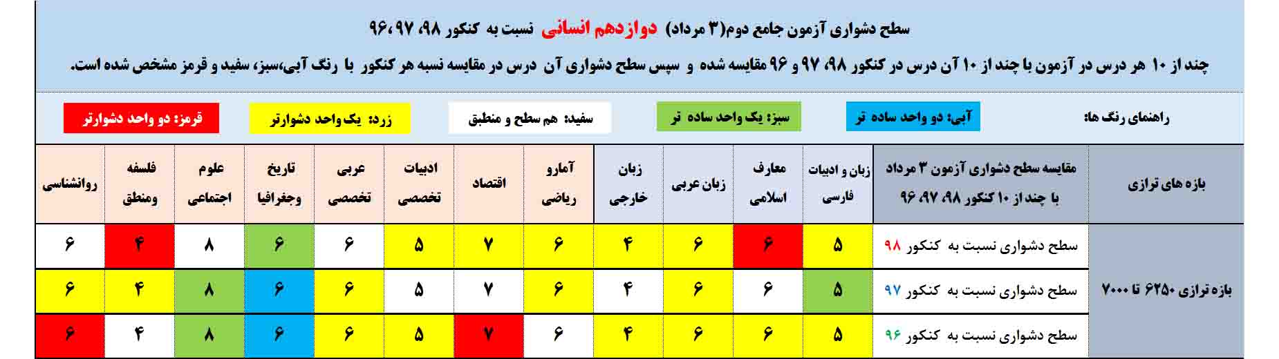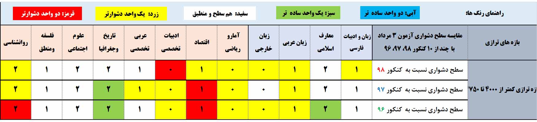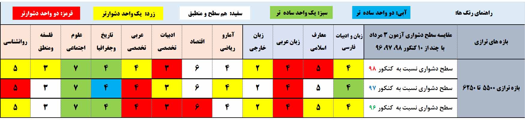 نسبت به کنکور 97: درس های فارسی،تاریخ جغرافیا و علوم اجتماعی نسبت به کنکور 97 برای این بازه ترازی ساده تر(خانه های آبی و سبز ردیف دوم) ، بقیه درس ها نسبت به کنکور 97 دشوارتر بوده است(خانه های زرد ردیف دوم).