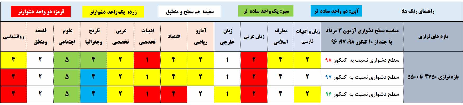 نسبت به کنکور 96: معارف،ریاضی و فلسفه منطق برای انی بازه ترازی هم سطح با کنکور 96( خانه های سفید ردیف سوم)،تاریخ جغرافیا و علوم اجتماعی ساده تر (خانه های سبز و آبی ردیف سوم) و بقیه درس ها برای انی بازه ترازی نسبت به کنکور 96 دشوارتر بوده (خانه های زرد و قرمز ردیف سوم)