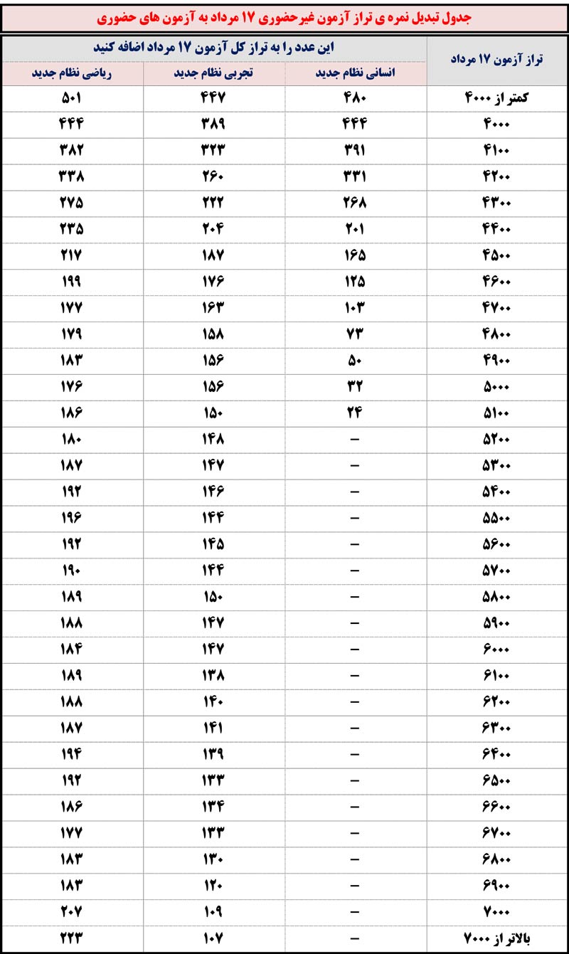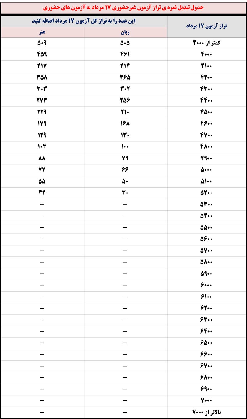 جدول تبدیل تراز آزمون غیرحضوری آزمون 17 مرداد به آزمون حضوری را در ادامه مشاهده کنید.در این جدول ها تراز کل در نظر گرفته شده است.