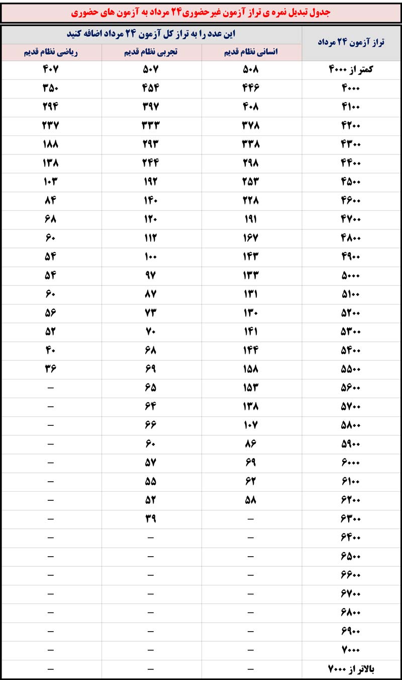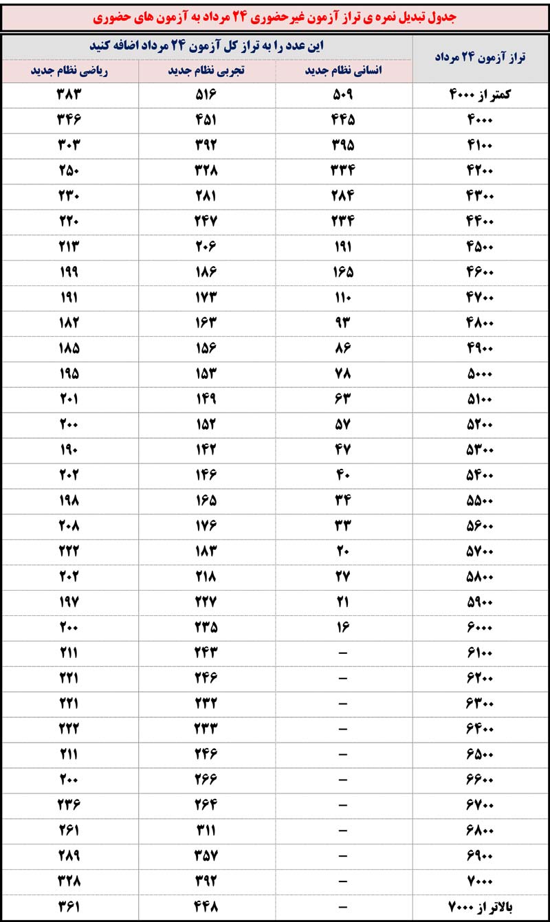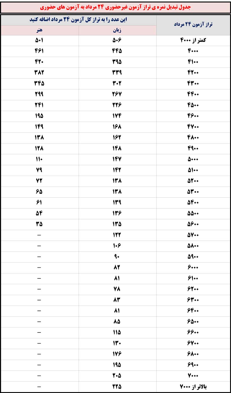 جدول تبدیل تراز آزمون غیرحضوری آزمون 24 مرداد به آزمون حضوری را در ادامه مشاهده کنید.در این جدول ها تراز کل در نظر گرفته شده است.