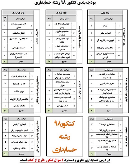 در جدول زیر، بودجهبندی درسهای اختصاصی (فنی) رشته حسابداری در کنکور 98 را به صورت پودمان به پودمان میبینید.