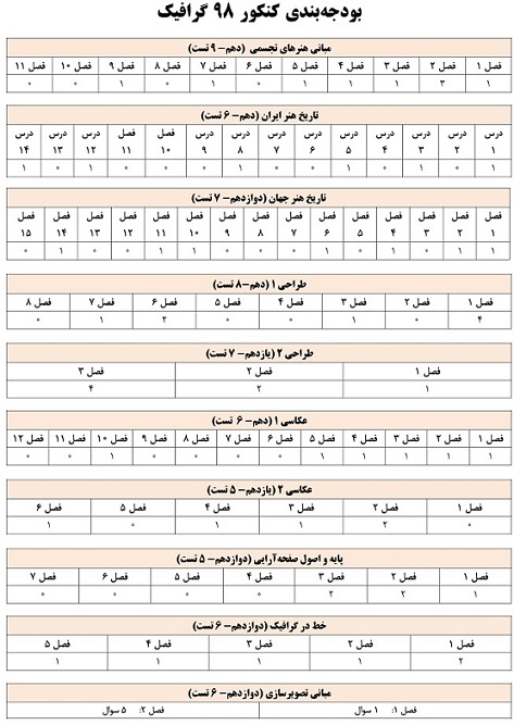 در جدول زیر، بودجهبندی درسهای اختصاصی رشته گرافیک در کنکور 98 را به صورت درس به درس میبینید.