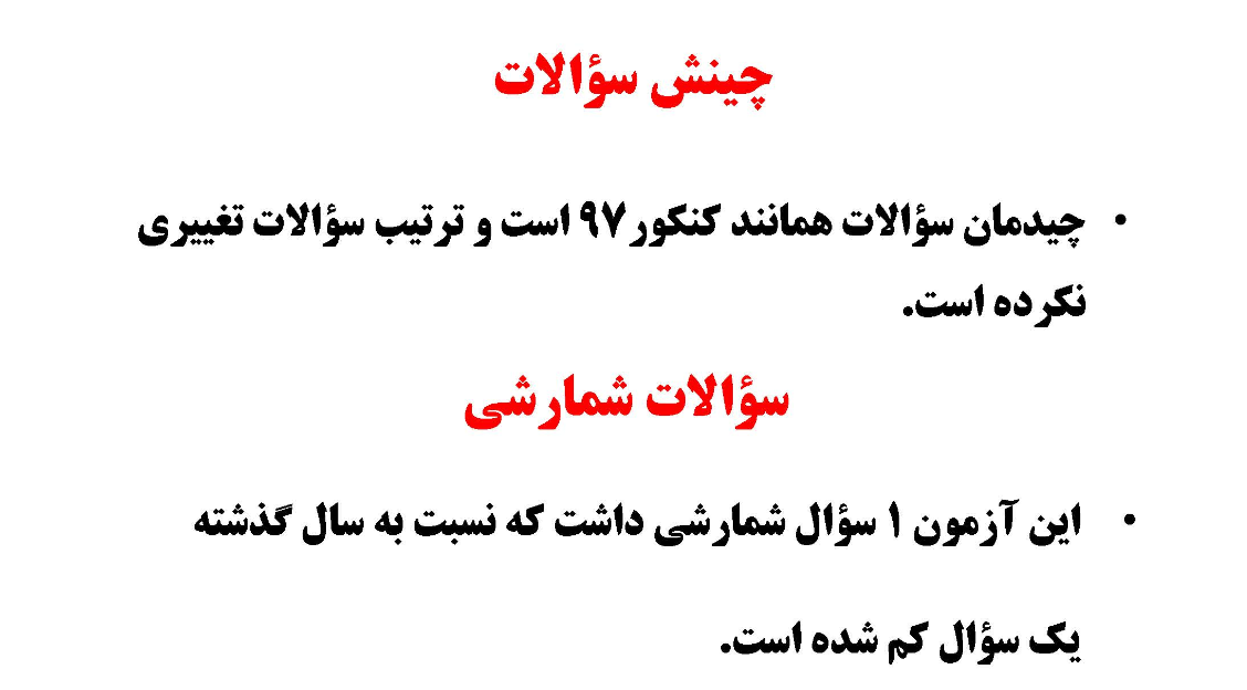این مطلب بررسی رویکردها و گرایشهای درس فارسی در کنکور 98 - منحصراً زبان است که با مقایسه با کنکور 97 از نظر ساختار، چینش سؤالات، بودجهبندی و محتوا تنظیم شده است.