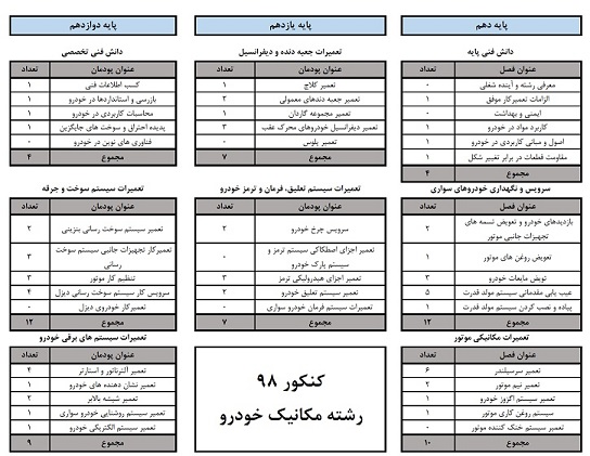 در جدول زیر، بودجهبندی درسهای اختصاصی (فنی) رشته مکانیک خودرو در کنکور 98 را به صورت پودمان به پودمان میبینید.