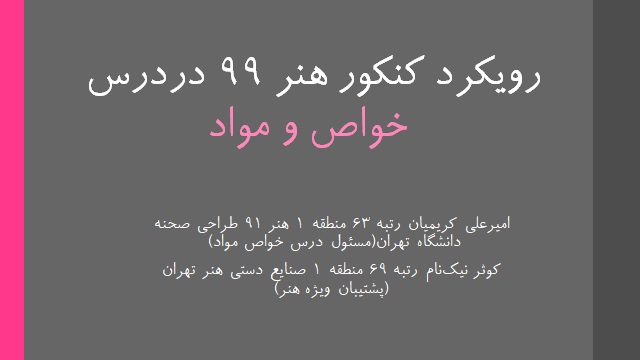 امیرعلی کریمیان رتبه63 منطقه 1 هنر طراحی صحنهدانشگاه تهران _ مسئول درس خواص مواد و مدرس درس خواص مواد
