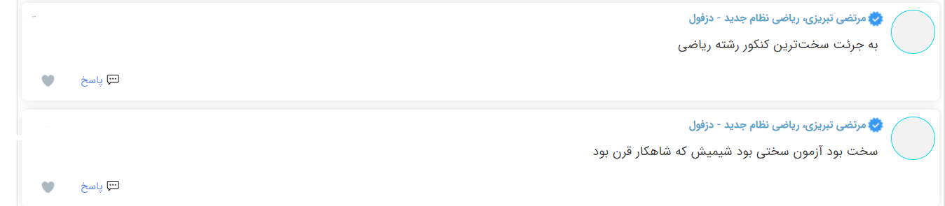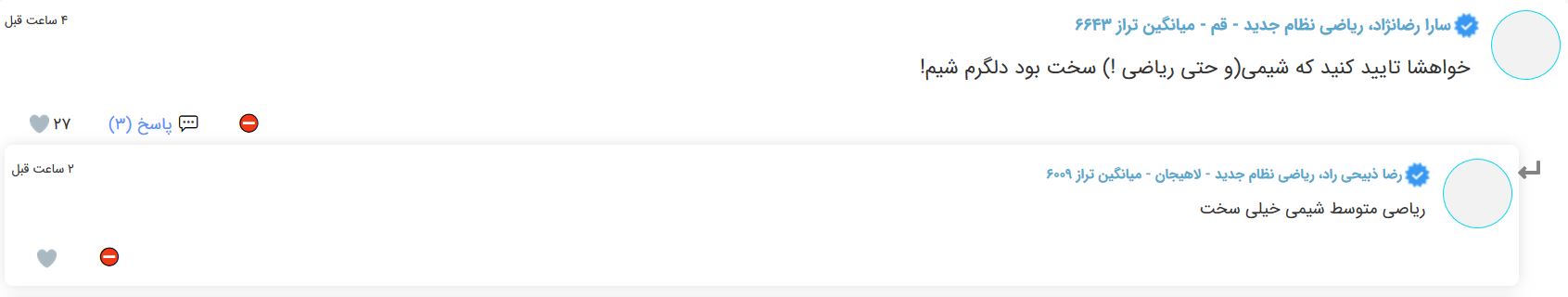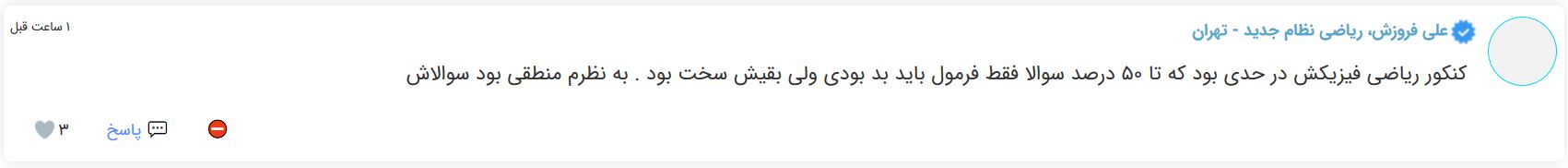 پس از برگزاری آزمون ها تعداد زیادی کامنت درباره ی سطح دشواری آزمون ها داشتیم . در این میان اظهار نظر دانش آموزانی که با صفحه ی شخصی خودشان نظر دادند قابل اعتمادتر است زیرا دارای هویت مشخص و سطح تراز دانش آموز است و معلوم می شود اگر دانش آموزی می گوید سوال های یک درس از نظر او ساده یا دشوار بوده است وضعیت درسی خود او چگونه است. اکنون که این مطلب را مطالعه می کنید در صورتی که خود شما هم تمایل دارید می توانید نظر خود را از طریق صفحه ی شخصی تان در قسمت کامنت ها (نظرات) بنویسید.