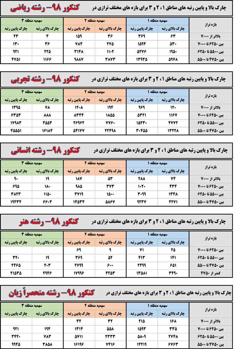 این جدول به شما نشان می دهد دانش آموزان کانونی بازه های مختلف ترازی ، در کنکور 98 و در مناطق 1 ، 2 و 3 چه رتبه هایی کسب کرده اند.