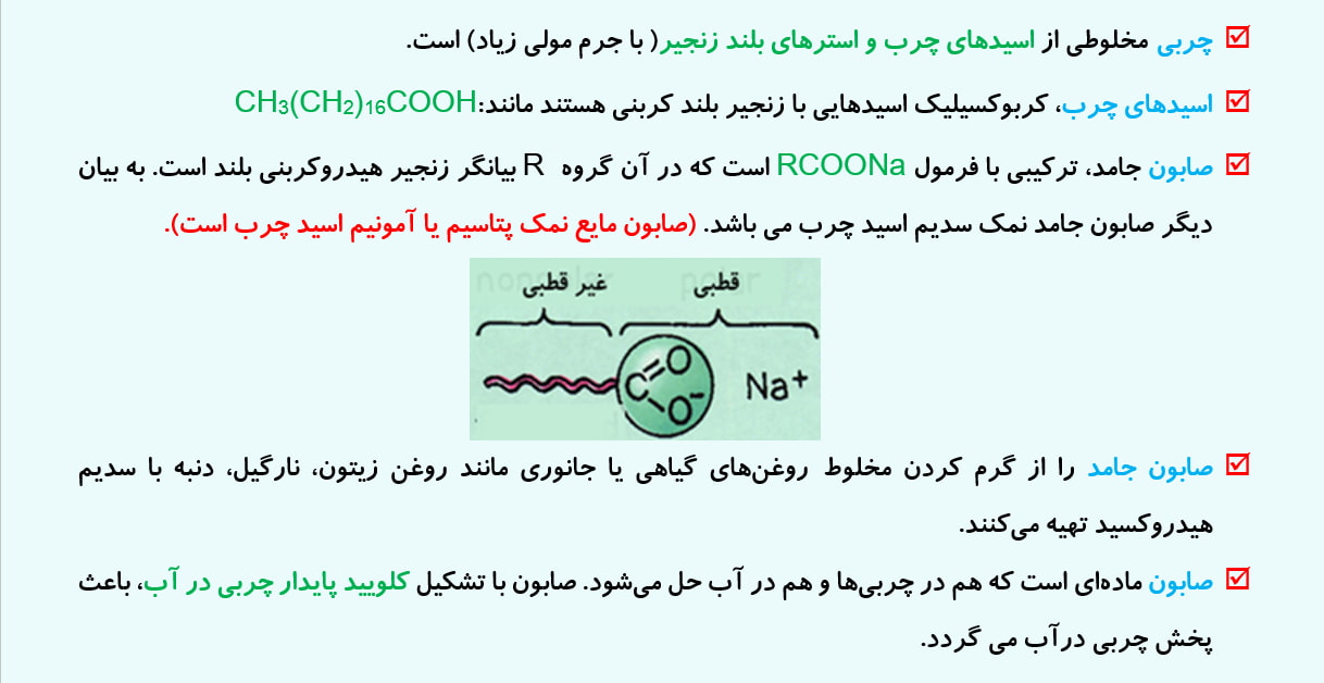 کامنت  کاربر: دقت کنید که صابون ترکیب مولکولی نیست! و هنگام انحلال صابون‌ها در چربی، اصلا صابون‌ها تفکیک نمی‌شوند._تاریخ ثبت: 13990428