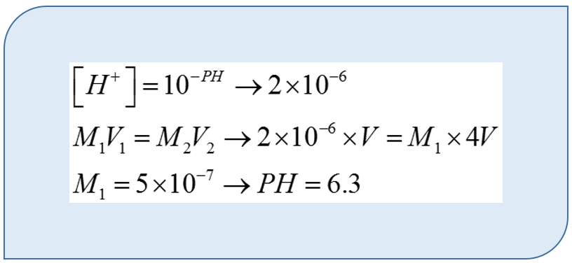 پاسخ کامنت  فاطمه جعفری بخشکندی، تجربى نظام جدید -  سلماس - میانگین تراز 6992: گزینه 2 درسته.  از رابطه حجم اولی ضربدر غلظت اولی مساوی حجم دومی ضربدر غلظت دومی میشه استفاده کرد (چون مول هاش مثبت ثابته) که غلظت دومی اینجا به دست میاد 5ضربدر ده به توان منفی 7. و از اونجا پی هاش به دست میاد 6.3_تاریخ ثبت: 13990312