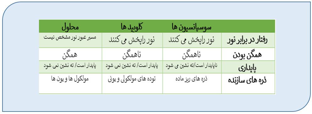 کامنت  کاربر: وقتی میگه مسیر عبور نور در این ماده مشخصه یعنی نور رو پخش میکنه یا عبور میده؟ این سوال درباره محلول‌ها و کلوئید و ایناست._تاریخ ثبت: 13990429