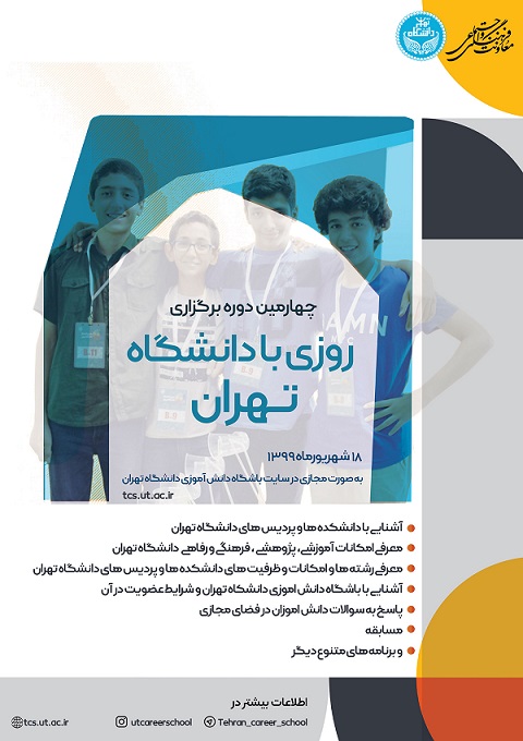 چهارمین برنامه «روزی با دانشگاه تهران» روز سه شنبه ۱۸ شهریور ماه به صورت مجازی در سایت باشگاه دانش آموزی دانشگاه تهران برگزار میشود.