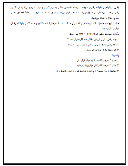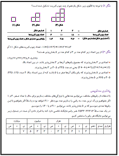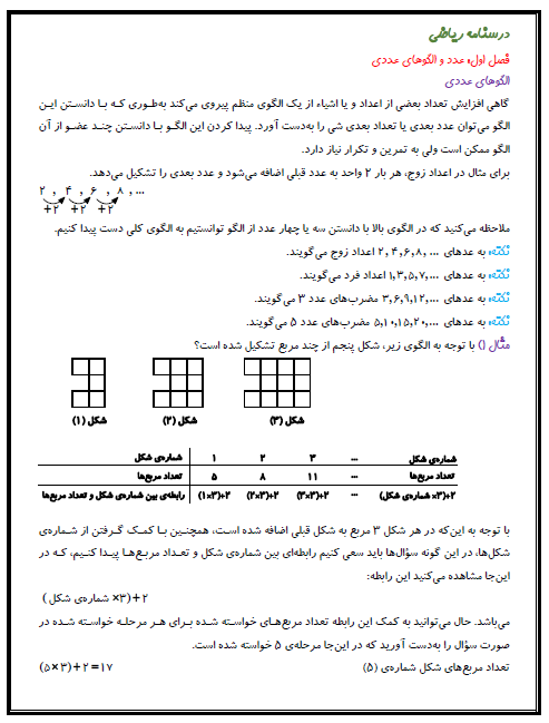 درسنامه درس ریاضی برای فصل اول (عدد و الگوهای عددی) مرتبط با قسمتهای الگوهایی عددی و یادآوری عدد نویسی برای شما آماده و قرار داده شده است. با توجه به شرایط پیش رو و محدودیتهایی حاصل شده به جهت شیوع بیماری کرونا و دوری از مدرسه، استفاده از این درسنامهها به شما کمک خواهد کرد که مطالب را بیشتر مرور و تمرین کنید.