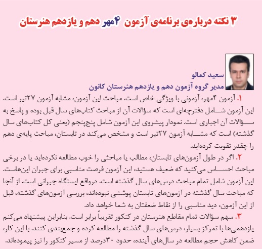 نکاتی درباره آزمون 4 مهر یازدهم هنرستان