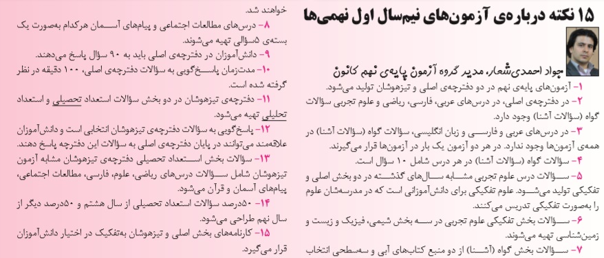 نکاتی در رابطه با آزمون های نیم سال اول پایه نهم را مشاهده نمایید.