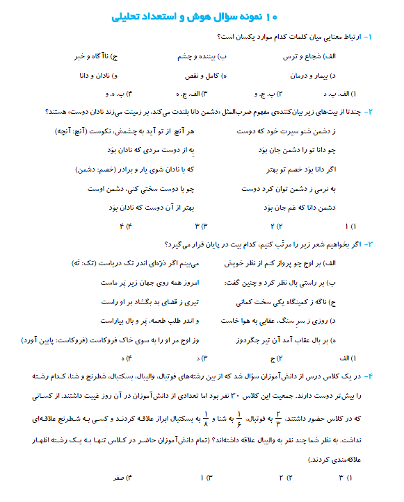 دانشآموزان ششمی10 نمونه سؤال هوش و استعداد تحلیلی برای شما در ادامه قرار داده شده است. فایل سؤالات را نیز در ادامه میتوانید دریافت کنید. موفق باشید
