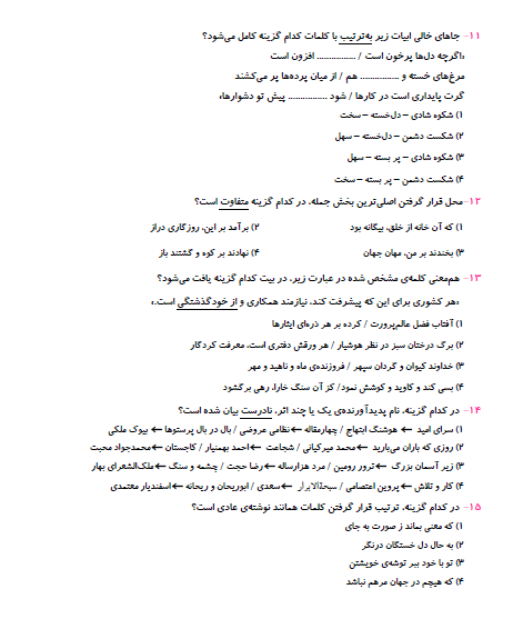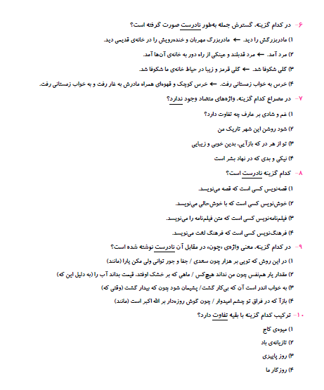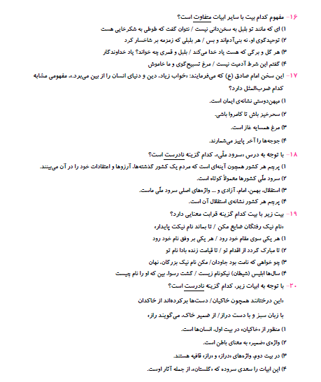 در ادامه برای شما نمونه سوالات فارسی مشترک (مباحث سال پنجم دبستان) آورده شده است. این سوالات را پاسخ دهید و سپس پاسخ خود را با فایل پی دی اف که بعد از سوالات برای شما قرار داده شده است مقایسه کنید.