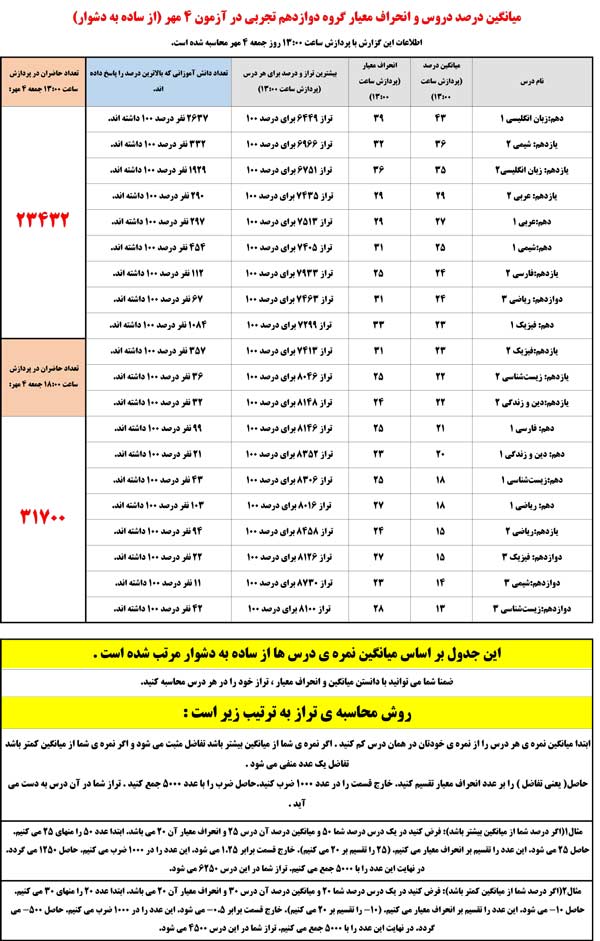ضمنا شما می توانید با دانستن میانگین و انحراف معیار ، تراز خود را در هر درس محاسبه کنید. روش محاسبه ی تراز به ترتیب زیر است :