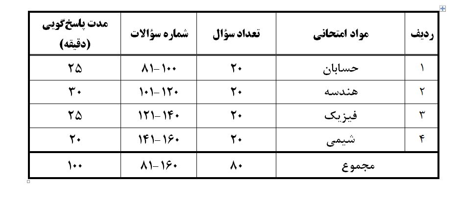 این آزمون برای دانش آموزانی که در آزمون های تابستان شرکت کردند نقش یک آزمون جمع بندی و برای دانش اموزانی که تازه به جمع کانونی ها پیوستند نقش یک آزمون تعیین سطح را دارد. با توجه به این موضوع مباحث این آزمون از کل دهم و یازدهم و بخش بسیار کمی از درس های دوازدهم است. در جدول زیر منابع اختصاصی این آزمون و زمان پاسخگوی آن اورده شده است.