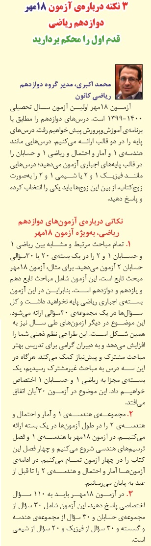نکاتی درباره آزمون 18 مهر دوازدهم ریاضی