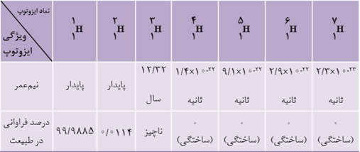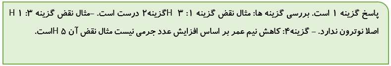پاسخ کامنت کاربر: گزینه یک: استدلالها همه ایزوتوپهای پرتوزا هیدروژن نیم عمرشون کمتر از یک ثانیه نیست، مثال نقض (ایزوتوپ پرتوزا طبیعی) دو درسته اشتباه (یکیشون نوترون نداره)، مثال نقض ایزوتوپی که عدد جرمیش چهار هست._تاریخ ثبت: 13990628
