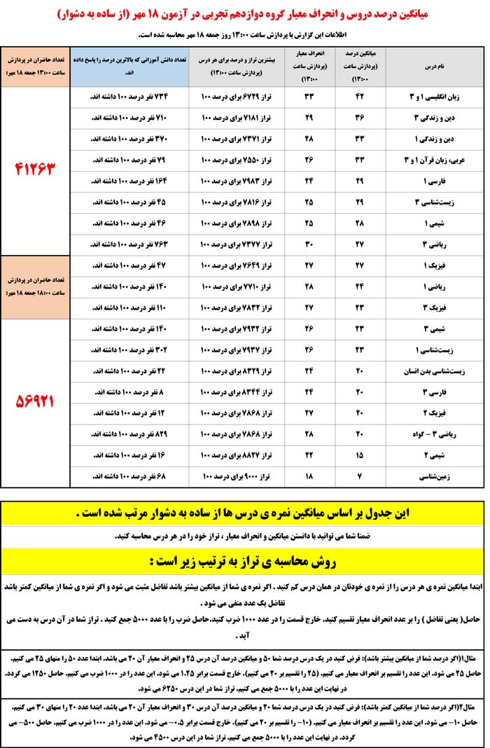 ضمنا شما می توانید با دانستن میانگین و انحراف معیار ، تراز خود را در هر درس محاسبه کنید. روش محاسبه ی تراز به ترتیب زیر است :