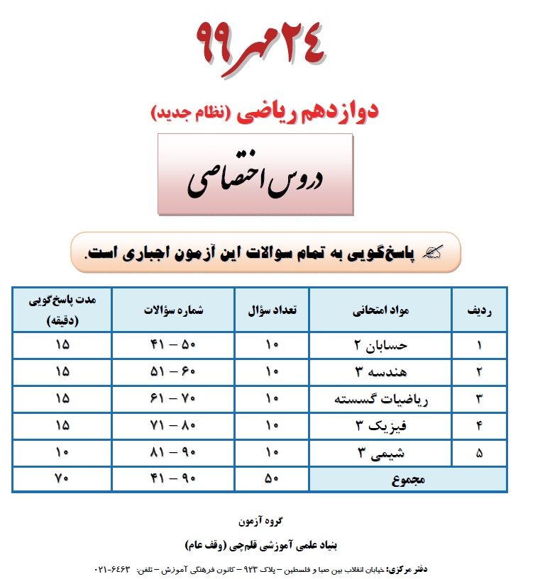 اولین آزمون هدف گذاری در تاریخ 24 مهر برگزار خواهد شد. از کارنامه این آزمون می توانید استفاده کنید و برای آزمون 2 آبان هدف گذاری صحیح تر و واقعی تری داشته باشید. آزمون 2 آبان دوازدهم ریاضی در درس حسابان مربوط به مبحث تابع است. آیا قبل از مطالعه این مبحث در هفته اول قبل از آزمون می توانید حدس بزنید به چند سوال از 10 سوال این مبحث را پاسخ خواهید داد؟ با شروع مطالعه در هفته اول و رسیدن به پنج شنبه شاید شناخت بهتری از وضعیت خود در مبحث تابع داشته باشید این موضوع با دادن یک آزمون هدف گذاری که نقش قلق گیری شما را دارد، کامل می شود. در نهایت یک هدف گذاری درست و منطقی برای آزمون هفته بعد خواهید داشت. در جداول زیر نام درس و تعداد سوال های آزمون هدفگذاری 24 مهر را مشاهده می کنید