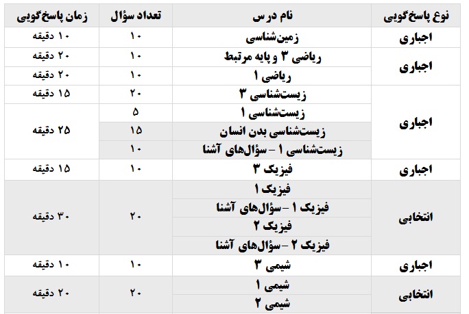تعداد سؤال اختصاصی 140 سؤال و زمان پیشنهادی برای پاسخ گویی به اختصاصیها، 165 دقیقه است.