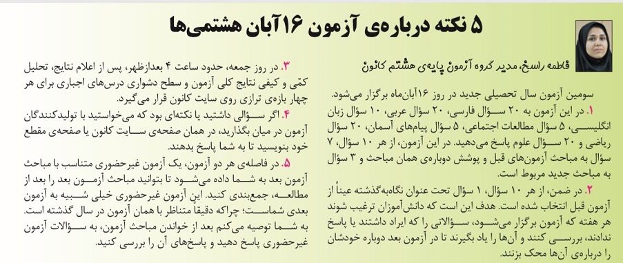 نکاتی در مورد آزمون 16 آبان پایه هشتم