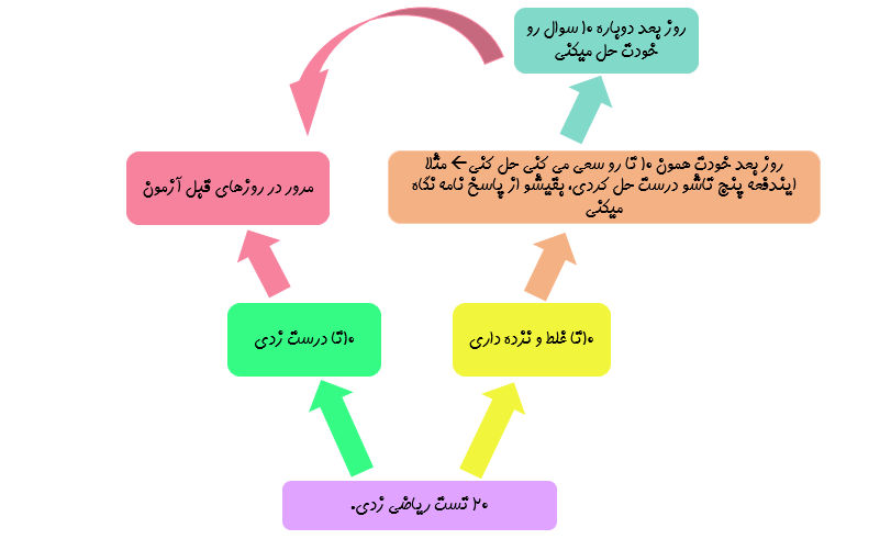 برای فهمیدن هر سوال اختصاصی و محاسباتی فقط باید خودت چندین بار حلش کنی تا تو ذهنت حک بشه حتی اگه هر دفعه به شکست بخوری اما بالاخره بار آخر می تونی. چون به صرف نگاه کردن پاسخنامه احساس یادگیری کاذب می کنی. پس چی شد؟ امروز 20 تا تست میزنی بعد 10 تا غلط و نزده داری فرداش میای همونا رو دوباره خودت حل میکنی ممکنه پنج تاشو درست حل کنی پنج تای بعدی رو از پاسخ نامه نگاه می کنی و روز بعد همون ده تا رو دوباره خودت حل می کنی. شاید بگی اینکه خیلی زمان بره اما مطمئن باش به نفع خودته و تاثیرش رو حتما می بینی.