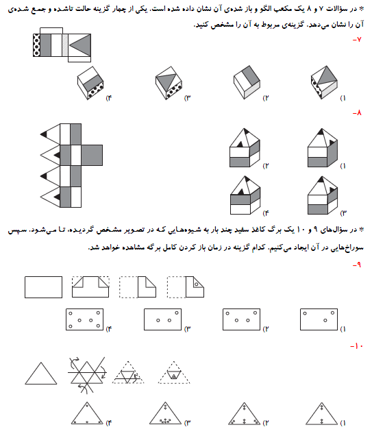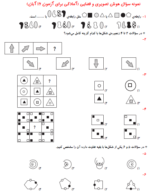 10 سوال هوش تصویری و فضایی ویژه ی آمادگی برای آزمون 16 آبان در ادامه آورده شده است. این سوالات را پاسخ دهید و سپس پاسخ خود را با فایل پی دی اف که بعد از سوالات برای شما قرار داده شده است مقایسه کنید.