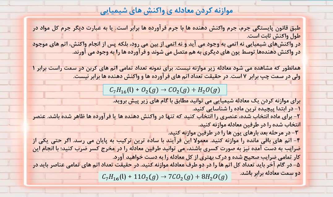 برای یادگیری بهتر این موضوع میتونید به فیلم استوکیومتری (موازنه و استوکیومتری واکنش) مراجعه کنید.