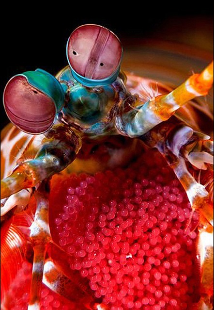 میگوی «مانتیس» پس از تخمگذاری، از فرزندان خود محافظت میکند.