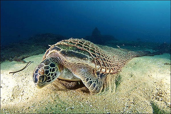لاکپشت دریایی در میان توری در دریای کورتز به دام افتاده است. اکنون 6 گونه از 7 گونهي لاکپشتهای دریایی در اتحادیهي بینالمللی محافظت از گونههای در حال انقراض بهعنوان گونههای آسیبپذیر، در حال انقراض یابحرانیاعلام شدهاند.