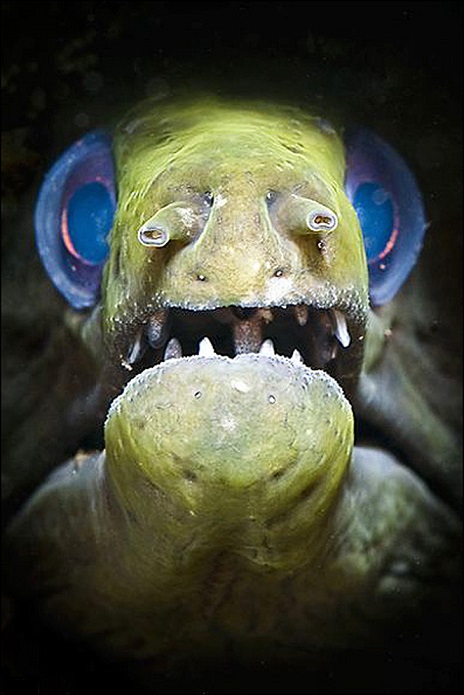 پرترهای از مارماهی چشمآبی در آبهای اندونزی را میبینید. این جاندار تا ۵/۱ متر رشد میکند.