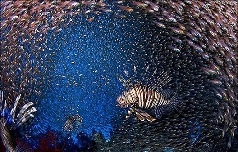 شیرماهی بهتنهایی در میان مدرسهي «گِلَس فیشها» شنا میکند. افزایش جمعیت این گونه از ماهی سمی در مناطق مختلف، نگرانیهایی را به وجود آورده است.