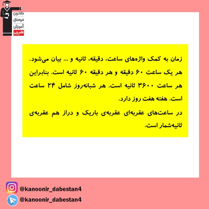 عکس هایی که در ادامه قرار گرفته است،نکات اندازه گیری زمان فصل چهارم ریاضی چهارم دبستان(فصل اندازه گیری) می باشد ، مطالعه ی این نکات و حل مثال های موجود در آن به یادگیری این مبحث کمک می کند.