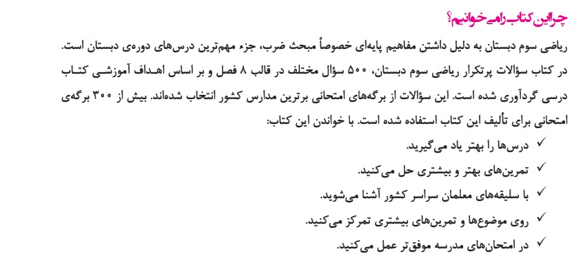 با نزدیک شدن به آذر ماه و جمع بندی نیمسال اول ، به کتابهائی نیاز داریم که بتوانند به ما برای موق شدن در امتحانات مدرسه کمک کنند. یکی از این کتابها کتاب سوالات پرتکرار امتحانی ریاضی سوم دبستان است. در این متن با ویژگی های مهم این کتاب آشنا می شوید.