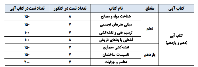 همانطور كه ديده مي شود 51 سؤال از 65 سؤال كنكور اختصاصي رشتة نقشه كشي معماري از كتاب هـاي درسـي دهـم و يـازدهم طـرح ميشود (78 %سؤالات كنكور).