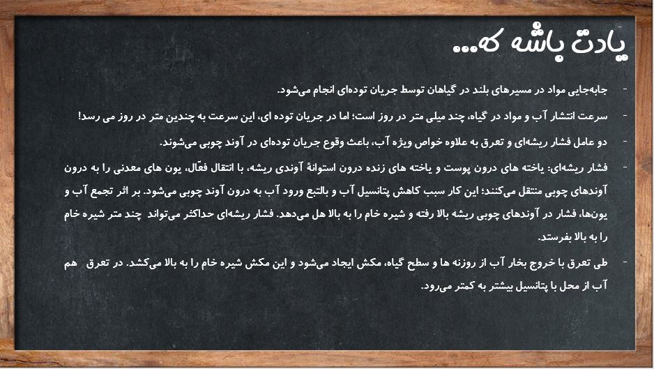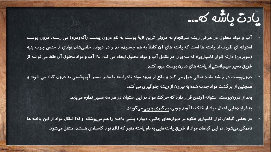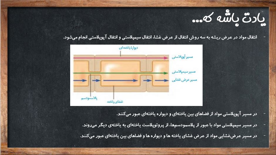 کامنت کاربر: در جا به جایی مواد در گیاهان در عرض ریشه:آندودرم ب دلیل داشتن نوار کاسپاری در دیوارهی جانبی خودش تنها مانع عبور مواد از مسیر آپوپلاستی میشه؟چرا عبور مواد از مسیر عرض غشاهم متوقف نمیشه؟خب دیوارهی جانبی بین غشاهارم میپوشونه ک چوب پنبه ای شده. - تاریخ ثبت: 13990825