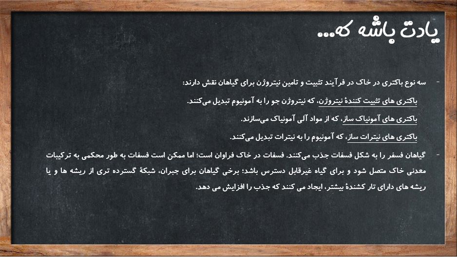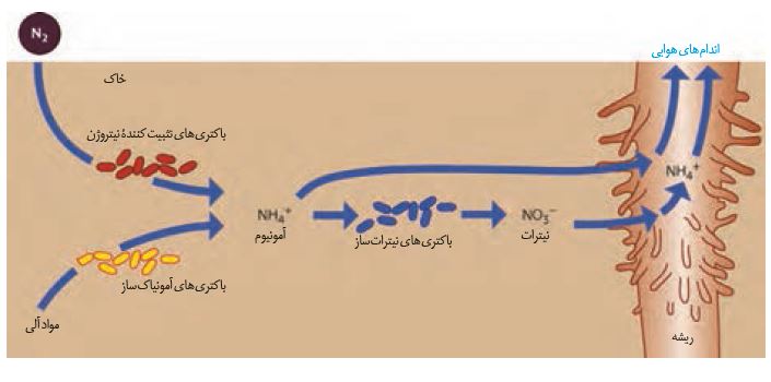 پاسخ تکمیلی: طبق شکل کتاب، به ترتیب باکتری های آمونیاک ساز، آمونیاک را وباکتری های نیترات ساز، نیترات را از منابعی بجز نیتروژن جو می سازند.