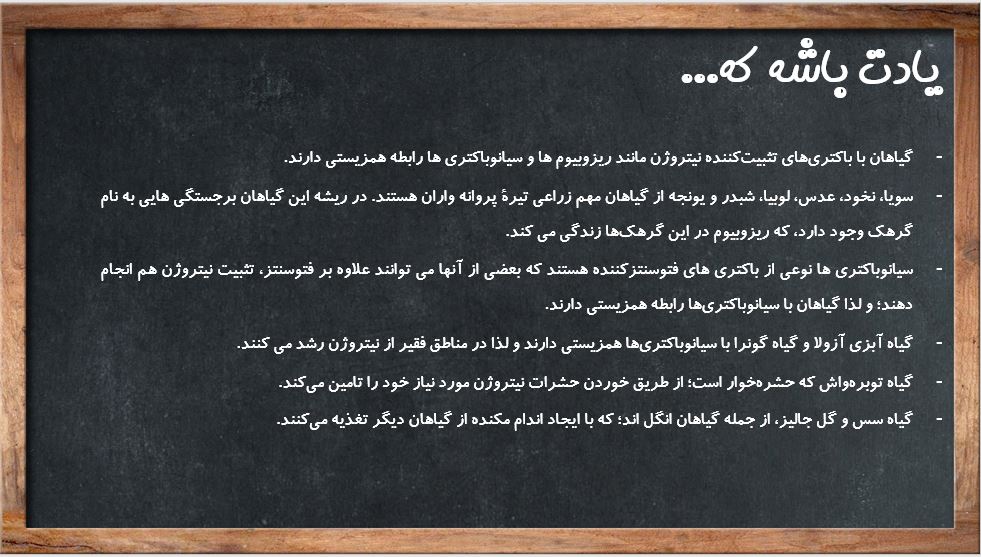پاسخ کامنت سپیده نجفى - گروه آزمون: تعریف باکتریهای تثبیت کنندهی نیتروژن رو از کتابتون بخونید،پیش ماده باید نیتروژن جو باشه - تاریخ ثبت: 13990824