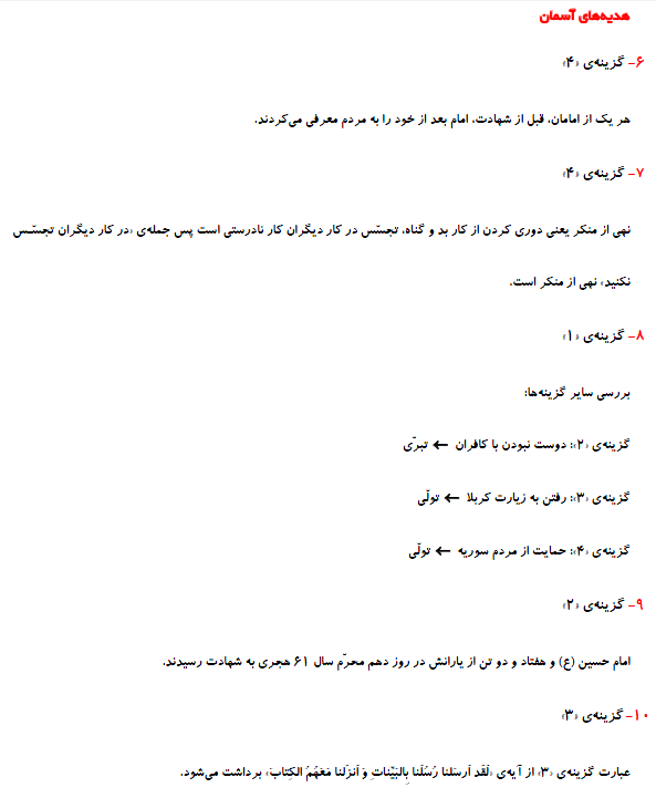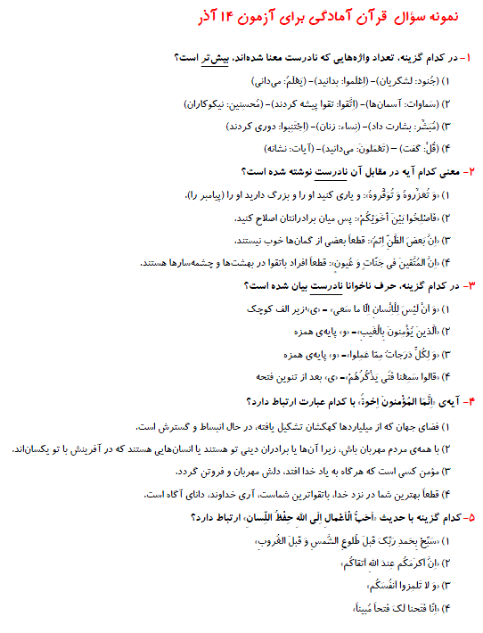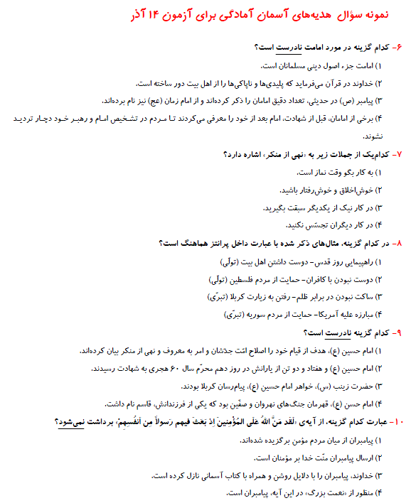 ششمی های عزیز سلام5 سوال قرآن و 5 سوال هدیه های آسمان ویژه ی آمادگی برای آزمون 14 آذر به همراه پاسخ تشریحی در ادامه آورده شده است. موفق باشید.فرزانه خاکپاش- گروه تولید آزمون