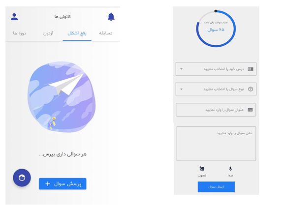 در طراحی انجام شده شما می توانید سوال خود را از هر منبع و درسی به صورت های تصویری(عکس از سوال)، نوشتاری(متن)ویا صوتی ارسال کنید.