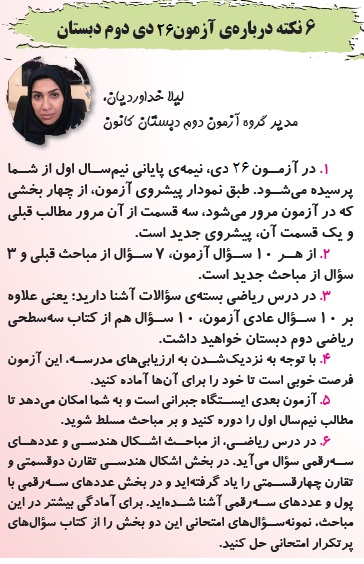 سؤالات آشنا: در درس ریاضی سؤالات آشنا دارید؛ یعنی علاوه بر 10 سؤال عادی آزمون، 10 سؤال هم از کتاب سهسطحی ریاضی دوم دبستان مطرح خواهد شد. پس برای آمادگی بیشتر میتوانید تستهای کتاب سهسطحی را تمرین کنید.