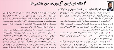 ۴. مثل همهی آزمونها، ده سؤال ریاضی تیزهوشان، ده سؤال فارسی تیزهوشان و ده سؤال استعداد تحلیلی (مجموعهی سی سؤال اختیاری تیزهوشان) پایانبخش دفترچهی هفتم است. پاسخگویی به این پرسشها، نمرهای جداگانه در کارنامه دارد.